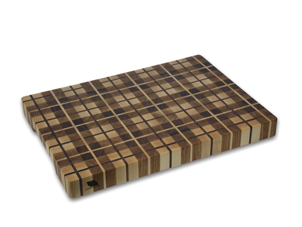 Krájecí prkénko z masivního dřeva. Složené ze segmentů javoru, dubu a amerického ořechu. Svým vzhledem připomíná vzor tkaniny tartan.